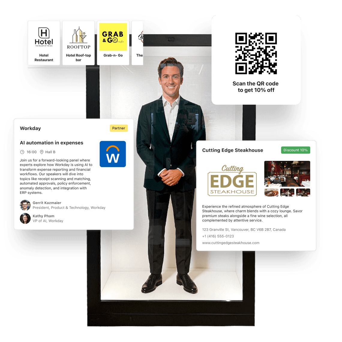 The holographic concierge responds with relevant sponsor content or exhibitor recommendations—turning each interaction into a monetizable engagement opportunity.