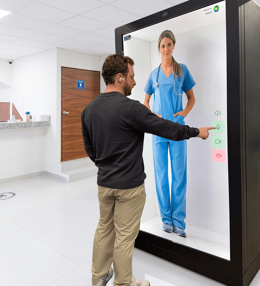 HumanBeam’s AI Concierge is designed for healthcare organizations that value both empathy and efficiency. The 3D holographic avatar greets patients, manages registration, verifies appointments, and provides directions in a calm, conversational tone. When deeper support is needed, HumanBeam Live allows real nurses or administrative staff to appear instantly in 4K 3D — combining automation with real human care.